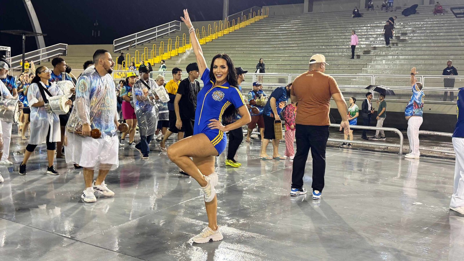 Nem mesmo a chuva torrencial que caiu durante o ensaio foi capaz de desanimá-la. Carla se entregou de corpo e alma ao momento, sambando com garra e emoção. À frente dos ritmistas da Acadêmicos do Tucuruvi, sua energia contagiou a todos e mostrou por que ela é considerada uma verdadeira rainha.